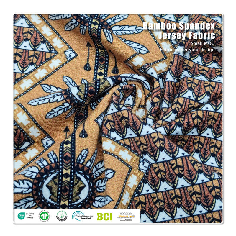 290 gsm 65 % bambu 27 % ekologisk bomull 8 % spandex tryckt tyg |